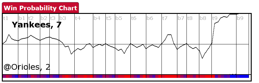 Even after the Martin HR, I don’t think many Orioles fans were ready to pack it in. However, the constant hits afterwards leading to a 6-2 score prior to Hunter coming in basically eliminated any chance of a comeback. To put it into perspective in terms of the WP through the game: